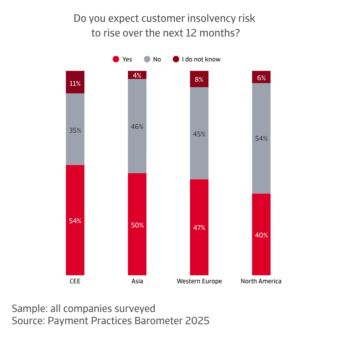 In Western Europe, expectations are more divided. Some businesses believe current conditions can hold, while others are bracing for deterioration, reflecting the region’s economic uncertainty. In Central and Eastern Europe, concern is more pronounced. Businesses in the region are particularly wary of a potential increase in insolvencies, given their exposure to global headwinds and the need for robust risk management.