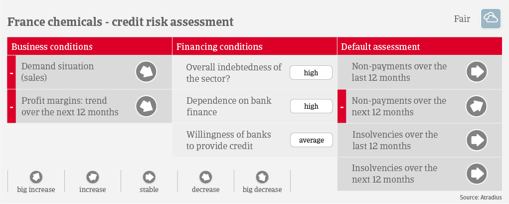 Payments in the industry take about 60 days on average domestically, while payment duration could be longer in export markets. Payment behavior has been good during the past two years, with a historically low number of payment delays. However, as very high energy costs negatively affect businesses´ margins and cash situation, we expect payment delays to increase in the coming 12 months by about 30%. That said, we expect only a slight increase in insolvencies of about 1%. Many companies in the chemicals sector are larger financially strong players, able cope with the difficult market environment. Therefore, we still assess the credit risk situation of the French chemicals sector as “Fair”. Additionally, the French government continues to support companies affected by high energy prices. Currently a proposal to double aid for energy-intensive businesses is under discussion. The government could also act as a guarantor for energy contracts.