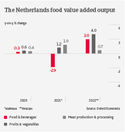 The Netherlands is one of the world´s largest exporters of agricultural-food products, with a focus on meat and dairy. Dutch food & beverages value added output is forecast to grow by 3% in 2022, supported by a rebound in exports.