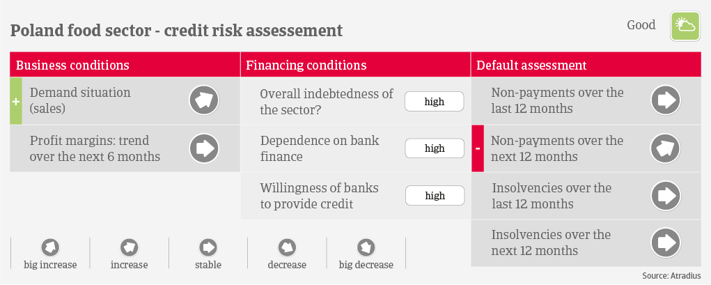 Payments in the industry take 30 days on average, and payment behaviour has been good over the past two years. Large extensions of payments are unusual, as businesses are afraid of any negative reputation as a “bad payer”. However, we expect a slight increase in payment delays of about 10% in the coming twelve months, as many businesses face higher input prices and lack options to pass them on. Insolvency numbers are low compared to other industries, and we do not expect a sharp increase in 2022. As the Polish food market remains dispersed, troubled businesses are often taken over by competitors instead of failing. The mid-term growth outlook for the Polish food sector remains good, and across all segments our underwriting stance remains open to neutral.