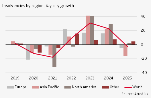 Our insolvency forecast for 2025 is mostly associated with a normalised environment in which insolvencies are driven by the dynamics in GDP. As monetary policy eases and the economic climate stabilises, the trend in insolvencies is likely to show an improvement next year. Globally, the insolvency trend is roughly stable (-3% year-on-year).