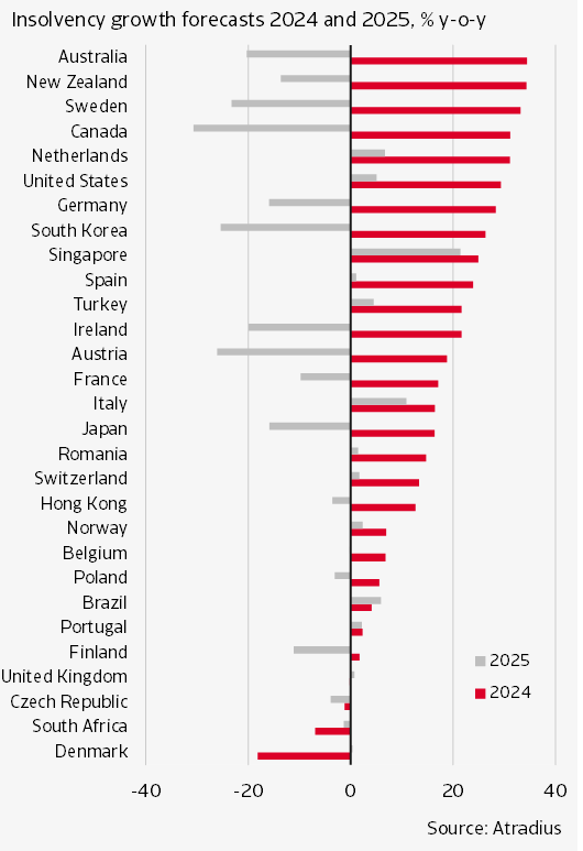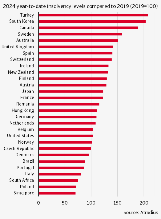 Countries like Turkey, South Korea, Canada, Sweden, and Australia have relatively high insolvency levels in 2024 compared to 2019. While each country faces unique economic challenges, some common factors contribute to the trend. In Turkey, the economy is slowing considerably in 2024 as the government has started to increase taxes and interest rates and is limiting access to credit. The growth slowdown and still-high interest rates is creating a challenging environment for the debt-burdened private sector to operate in. For South Korea, high corporate debt in combination with higher interest rates is weighing on the business environment. In Canada, companies are facing several challenges such as having to repay government loans taken out during Covid, high input costs and high labour costs. In Sweden, high insolvencies are attributed to the economic recession, high interest rates and high costs. A similar picture arises in Australia: weak consumer spending and high input costs squeeze companies’ profit margins, driving up insolvencies. Another factor that is contributing to Australian insolvencies is that the Australian Taxation Office is pursuing debts that were previously put on hold during the Covid pandemic.