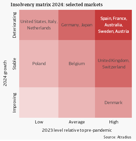 In a number of markets insolvencies already reached a level above normality. In some markets, like the UK and Switzerland, insolvencies are stabilising at an adverse new normal, while in other markets, like Austria, Canada and Sweden, there is a temporary spike in insolvencies in 2024.