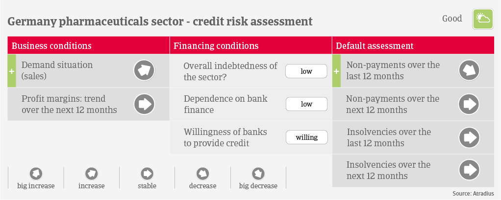 In general, German pharmaceutical businesses have robust equity, solvency and liquidity. Payments take 30-60 days on average. Compared with other German industries, the sector´s payment behaviour has always been better than average, with no notable payment delays. The insolvency environment is stable, and we expect business failures to remain at a low level. Due to the benign credit risk situation of most businesses and the good growth prospects in the coming years, our underwriting stance is open for producers, wholesalers/distributors and pharmacies/drugstores.