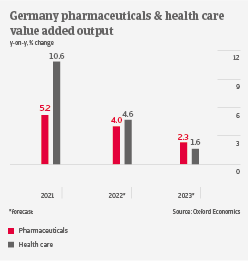 In 2020, Germany accounted for 4.5% of global pharmaceuticals production. Pharmaceuticals value added output is forecast to grow by 4% in 2022 and by more than 2% in 2023, after increasing 5.2% in 2021. Health care growth remains robust this year, expected to increase by more than 4%.