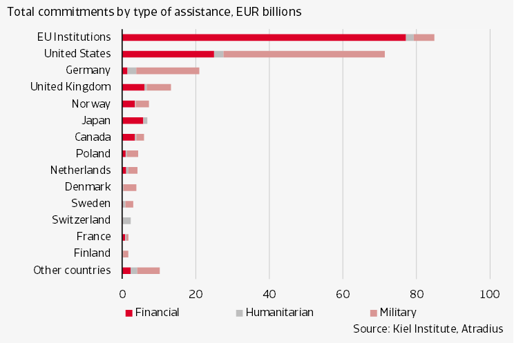 Since the large-scale Russian invasion in 2022, the cumulative aid pledged by the United States, the EU and other Western partners adds up to EUR 242 billion, of which EUR 128 is financial assistance, EUR 16 billion is humanitarian aid and EUR 98 is military aid. The top donors are the EU institutions and the United States, followed by several individual European countries. The composition of aid varies, however, with the US providing mostly military aid while the EU provides mostly financial assistance.