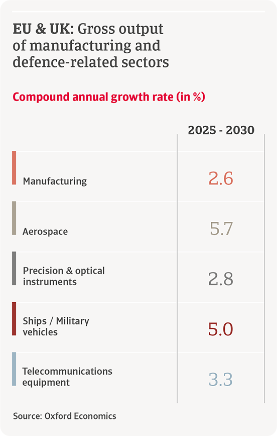 Despite misgiving around the extent of any manufacturing upturn, there will clearly be winners from Europe’s race to rearm. A concentrated subset of capital-intensive sectors will see the biggest output growth over the next five years. They include ships and military vehicles, aerospace, precision and optical instruments and telecom equipment. Compared to manufacturing, those sectors will see above average gross output growth in the coming five years in the EU and the UK.